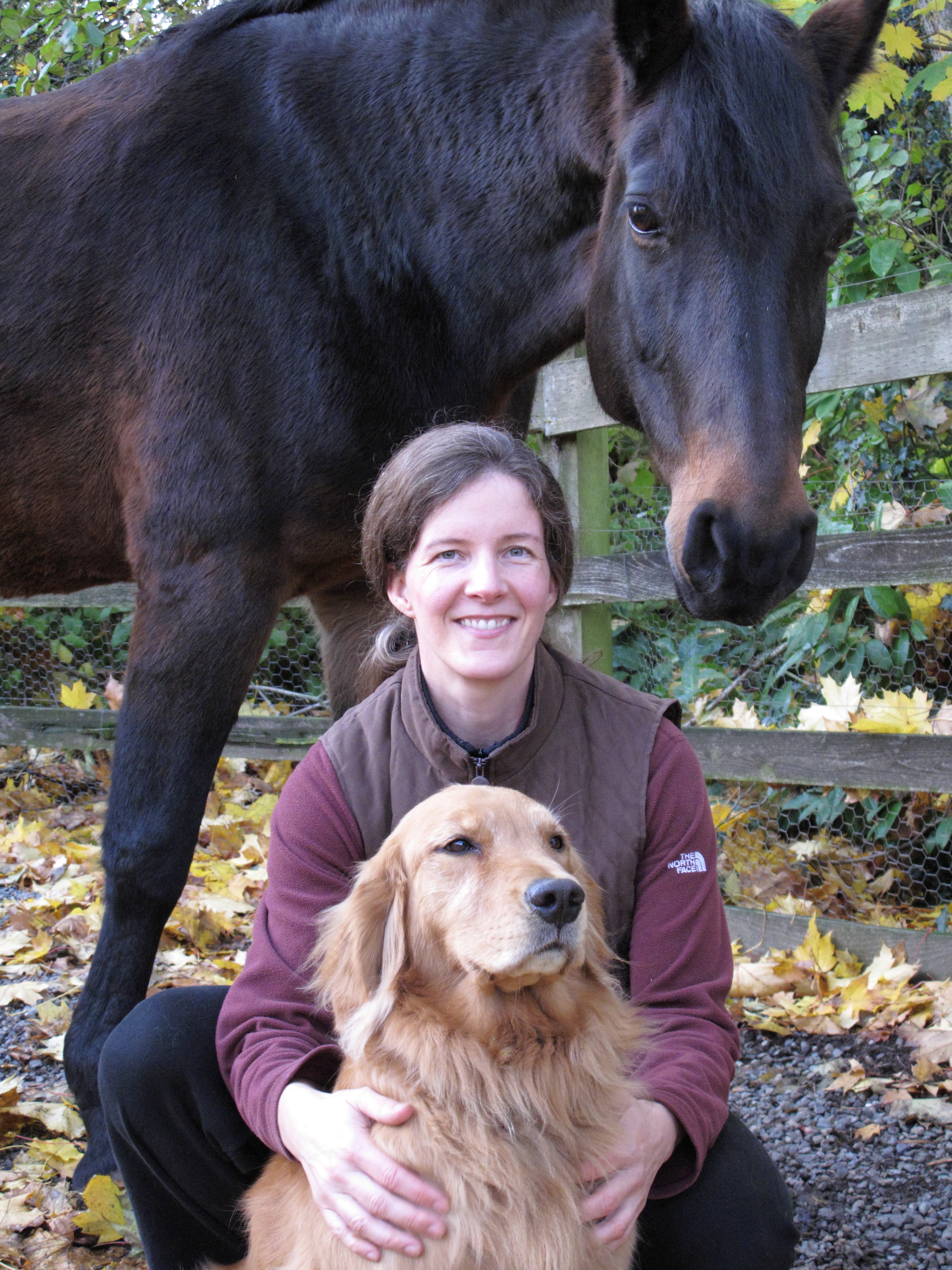 I’m Megan Ayrault, author of The Horse Lover’s Guide to Massage: What Your Horse Wants You to Know and more books and e-books on animal massage. Here’s a picture of me with one of my horses, Kiona, and one of our dogs, Rosie. You can learn more about my background here.
